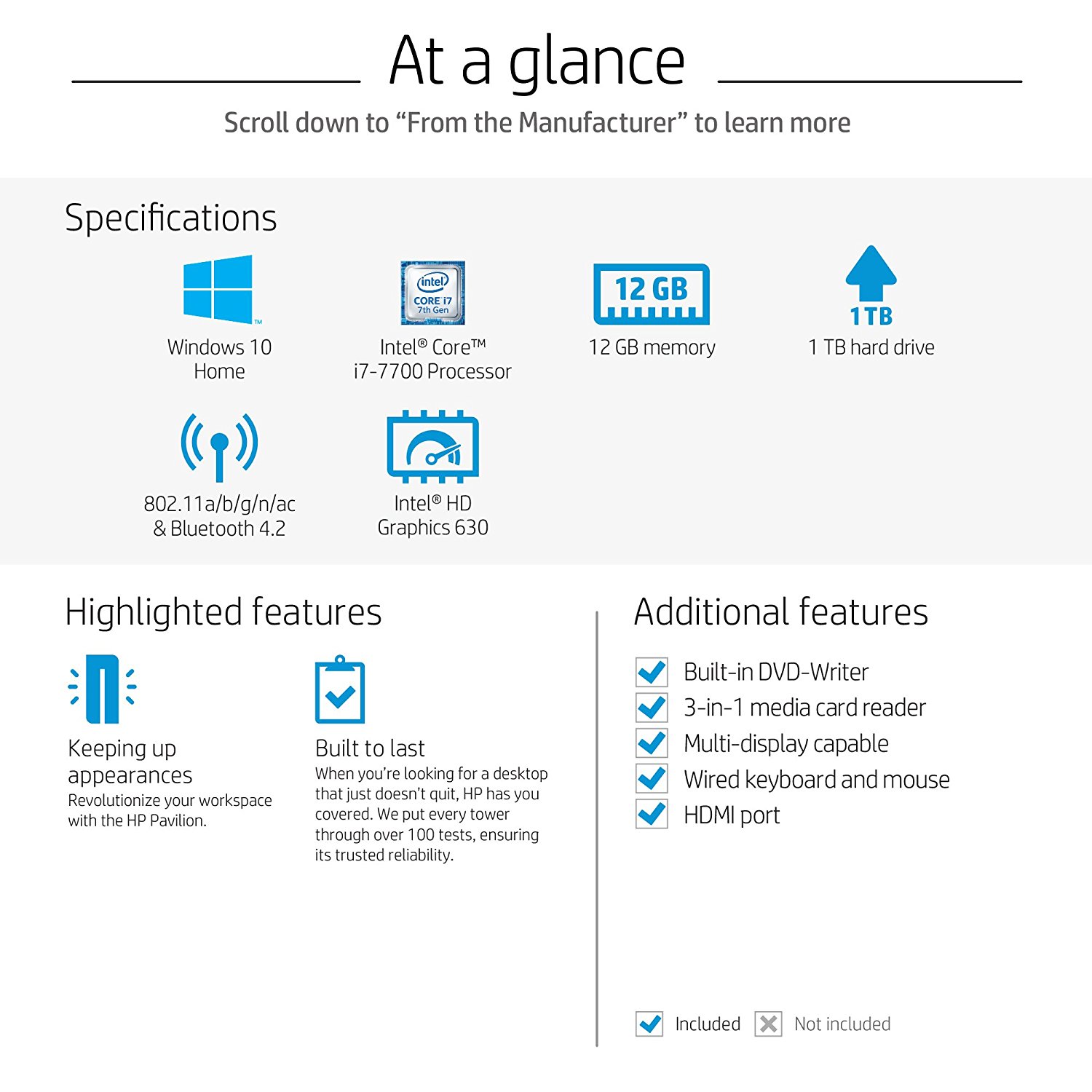 Ports: Headphone/Microphone Combo, 1 USB 3.0 (front), 1 USB 3.0 Type-C(TM) (front), 2 USB 2.0 (rear), 2 USB 3.0 (rear), HDMI Out (rear), VGA (rear), 10/100/1000 Base-T Network, and an HP 3-in-1 Media Card Reader help you stay connected.